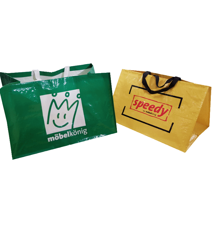 das Ausgangsmaterial für die Herstellung der PP-Woven-Taschen sind miteinander verwebte Striefen aus PP - Polypropylen. Somit sind die PP-Woven Taschen aus dem Selben Material hergestellt wie die PP-NonWoven-Taschen. Das Gewebe wird in der Regel mit einer Laminierung überzogen, welche die Stabilität und die Lebensdauer des Materials nochmals erhöht. Da das PP-Woven-Material keine glatte Oberfläche aufweist und somit nicht optimal für eine Bedruckung geeignet ist, erfolgt diese auf der transparenten Laminierung des Materials...